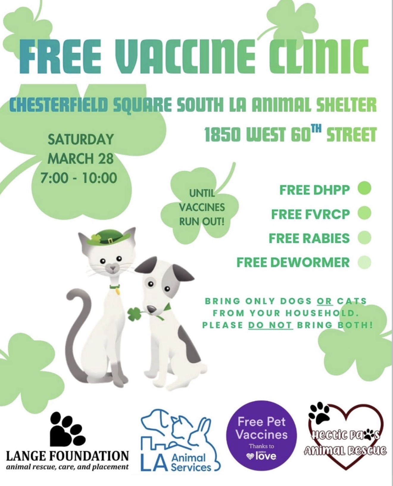 Please bring only dogs or cats from your household. Please do not bring both.