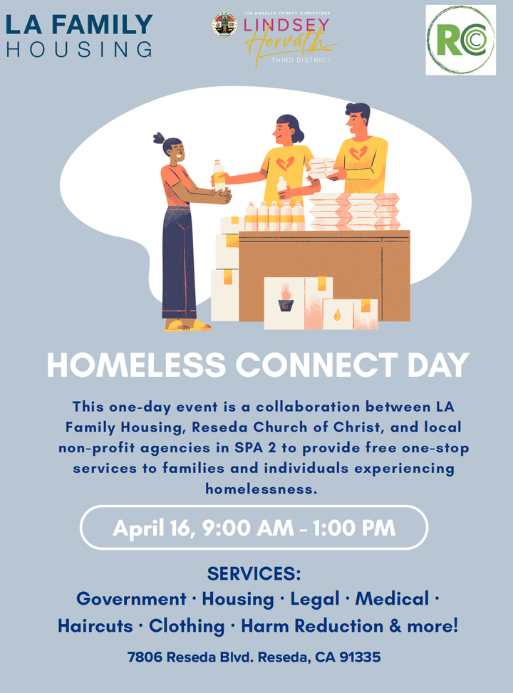Family Housing, Reseda Church of Christ, and local non-profit agencies in SPA 2 to provide free one-stop services to families and individuals experiencing homelessness.