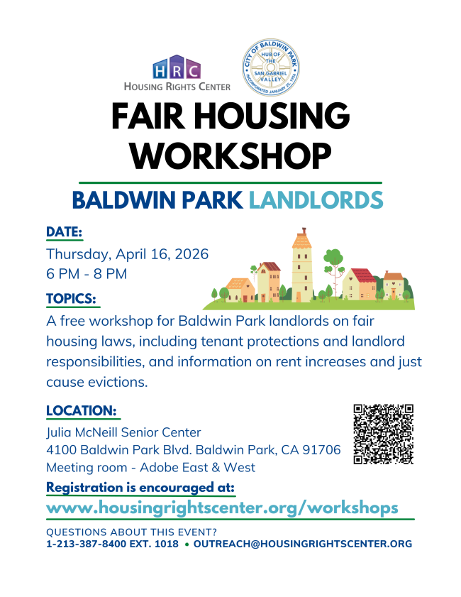 A free workshop for Baldwin Park landlords on fair housing laws, including tenant protections, landlord responsibilities, information on rent increases and just cause evictions.