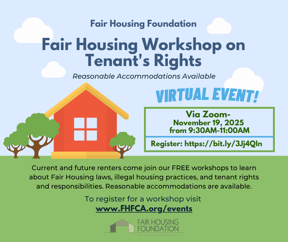 Current and future renters come join our FREE workshops to learn about Fair Housing laws, illegal housing practices, and tenant rights and responsibilities. Reasonable accommodations are available.