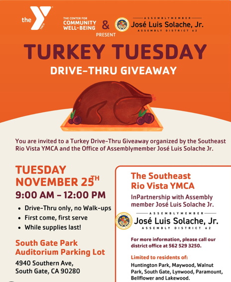 You are invited to a Turkey Drive-Thru Giveaway organized by the Southeast Rio Vista YMCA and the Office of Assemblymember José Luis Solache Jr.
