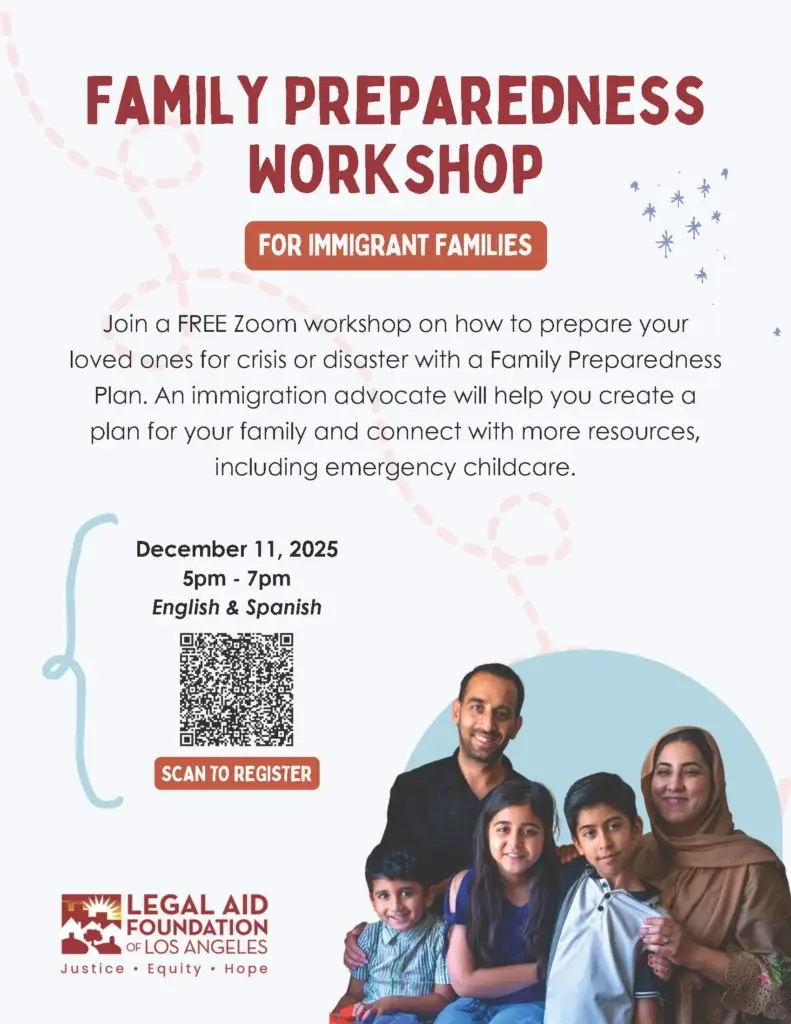 If you and your family are concerned about your rights and protections as immigrants during and after a crisis or disaster, join this free virtual workshop for practical steps to stay safe and prepared. You’ll learn about your rights during emergencies, build a personalized Family Preparedness Packet, and connect with resources to support your recovery and safety.